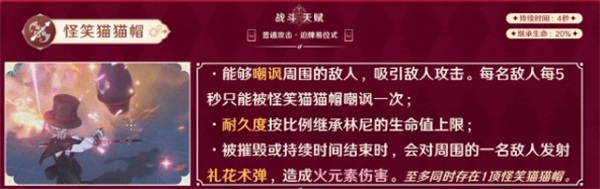 原神林尼的怪笑猫猫帽输出机制是什么?林尼的怪笑猫猫帽是在普通攻击的重击二段蓄力的命中敌人后召唤出来的,其主要功能是嘲讽周围的敌人,吸引他们的攻击。每一名敌人每5秒只能被怪笑猫猫帽嘲讽一次。它的耐久度是