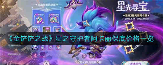 金铲铲之战是一款非常火热的自走棋游戏,星之守护者阿卡丽是近期推出的阿卡丽的星之守护者皮肤,许多小伙伴都想知道要入手它需要花多少钱,想要获得它需要在星光寻宝活动中进行抽奖,花费的抽奖次数与你的欧气值有关