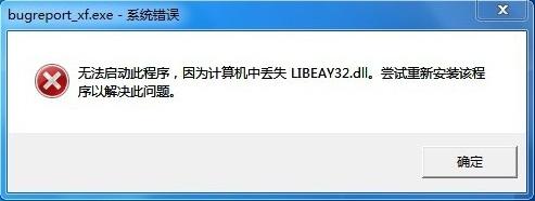 最近有很多使用win7系统的网友在运行程序的时候出现了bugreport_xf.exe系统错误的错误提示,显示“无法启动程序,因为计算机中丢失LIBEAY32.dll”,遇到这种情况该怎么解决呢?下面由系统城小编来跟大家介绍一下win7出现
