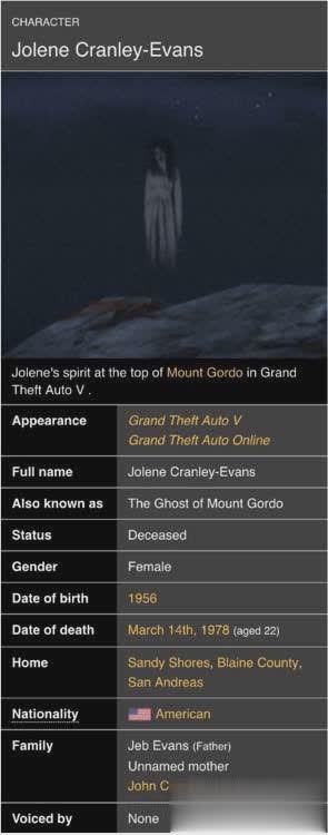 p>很多玩家问我GTA5女鬼彩蛋,我就给大家GTA5女鬼彩蛋误区详解,不知道的小伙伴赶紧和我一起看看。希望大家能够喜欢。点击下载:GTA5中文版 GTA5女鬼彩蛋误区详解 大家一定都记得gta5的女鬼彩蛋她的名字叫做Jolene Evans(有了老公之后叫Jolene Cranley Evans)什么?你说不是?你说她叫Leonora Johnson?住口!