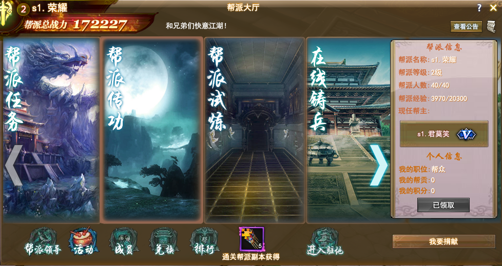 达到一定等级开启帮派系统,玩家可自创帮派也可以加入好友创建的帮派,从此和同帮派的义兄义弟一起称霸江湖。一起来看看我带来的武圣传公益服帮派怎么玩。 武圣传公益服帮派怎么玩 帮派系统:帮派主要有帮派任务、帮派传功、帮派试炼、在线铸兵和帮派副本这5类功能 玩家每天可以领取10环的帮派任务,击杀一定数量的野外怪物,获得相应奖励 帮派传