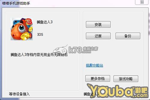 捕鱼达人系列游戏可以说是让无数的休闲玩家们非常痴迷,而游戏作品也的确有其独到的游戏魅力,新作品3目前已经开放可以体验了,大家最想要的无限金币修改或者存档都是非常急需的,我这里一来分享存档,二来分享教程。点击下载>>>捕鱼达人3无限金币存档注意:此存档只适用于ios苹果用户下载完之后,关闭游戏,手机连接电脑。打开存档,点击备份然后再点击安装。(