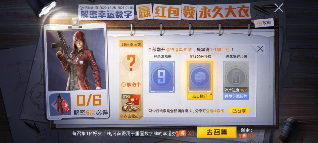 和平精英解密幸运密码是多少,最近和平精英上线了解密幸运密码的活动,玩家只需要每日完成任务解密一个数字密码,当积累了六次之后就可以获得永久的大衣,下面就来介绍下这个新活动吧!活动时间12月25日一1月3日23:59。每日数字牌获取说明1、每日登录获取:每日通过完成每日登录任务可获得1张数字牌,翻开后可获得系统随机分配的数字,不与在线获取的数字牌里复。12