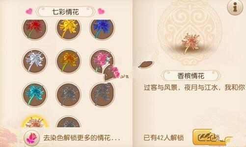 梦幻西游手游情花图鉴里面一共有11种不同颜色的情花,大部分情花都需要通过二次或者三次染色才可以获得,不能够直接种出来。其中难度比较大的就是梦紫情花和七彩情花了。梦幻西游手游梦紫情花怎么染色?梦紫情花怎么获取?梦幻西游手游梦紫情花染色攻略,梦紫情花染色配方。梦幻西游手游梦紫情花怎么染色?粉色情花+靛青染料=梦紫情花之前的建议是红+蓝这个方向考虑