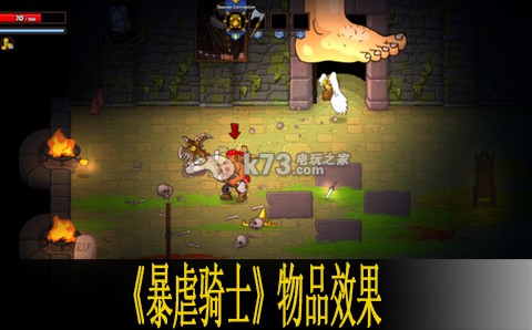 暴虐骑士在游戏过程中各类道具的使用时通关的必备条件之一,这里带来物品效果一览。xx药水:让你暂时强壮,但是踢人变得困难了。:消除毒素和疾病:巨大和强化力量射一个魔法球出去,可以蓄力。这东西对自己没有伤害,只会击飞自己,配合公鸡可无限回血公鸡(愤怒的鸡)暂无图效果:受到公鸡会下一个蛋,回复5hp,可以携带多只鸡。(用魔法珠射墙壁,击飞自己它也会