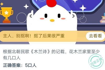 蚂蚁庄园木兰诗中记载了花木兰的详细信息,包括花木兰的家中人口,庄园小课堂的问题就是花木兰的家里有几口人,我会将10月14日的最新答案分享在下方,各位小伙伴可以一起来看看花木兰这道问题的答案。 蚂蚁庄园10月14日答案最新 的问题是:根据北朝民歌木兰诗的记载,花木兰家里至少有几口人?答案是:5口人答案解析:根据木兰诗中“爷娘闻女来,出郭相扶将;阿姊闻