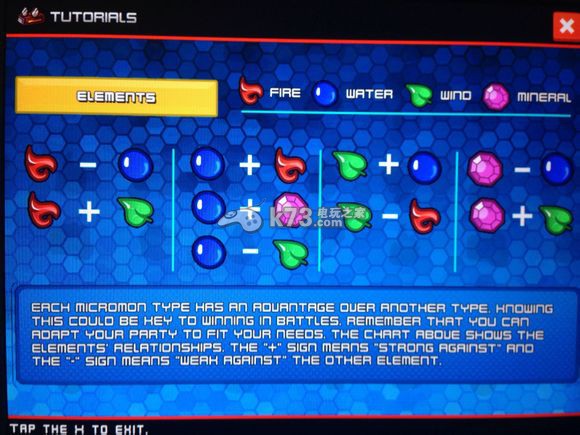 迷你怪物,Micromon同样也有着属性分类,主要有四大类属性,包括了红-火、蓝-水、绿-木以及紫-岩石,不同的属性之间也存在着相克之理,在属性上克制对方的时候会打出更多的伤害。红色代表火蓝色代表水绿色代表风紫色代表岩石下面是各属性相克表,两属性之间的[HEAVY PLUS SIGN]代表前一个克制后一个,[HEAVY MINUS SIGN]代表前一个被后一