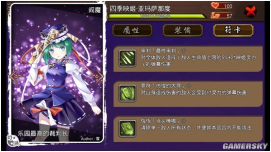 四季映姬·亚玛萨那度角色名:四季映姬·亚玛萨那度战力:160简介:放肆!把他给我打入地狱!欧证。四季初始属性非常不错,极高的灵力和优秀的命中可以让她的攻击非常暴力,但防御太低,而且攻击符卡5费无法开幕释放注定了她成不了一线队长人选。出击消耗信仰17,饭团3。推荐位置:攻击位,支援位,防御位攻击符:审判『最终审判』⑤30级觉醒,对敌