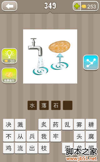 看图猜成语、疯狂猜成语第349关图片中,水龙头开着水,箭头上面一块石头,答案是什么成语?谜底答案:水落石出成语意思:水落下去,水底的石头就露出来。比喻事情的真相完全显露出来。 出处宋·欧阳修醉翁亭记:“野芳发而幽香,佳木秀而繁阴,风霜高洁,水落而石出者,山间之四时也。”宋·苏轼后赤壁赋:“山高月