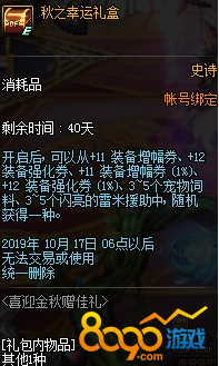 很多的玩家们都不知道DNF秋之幸运礼盒怎么获得,这个里面都有一些什么呢?到什么时候过期呢?现在的获取途径有几个呢?想知道这个答案的玩家们可以和小小鱼一起来看看DNF的最新消息吧,速来围观吧~ 其实大家想要获得这个礼盒的话,还是蛮简单的,大家只要得到小铁柱的谢礼就没问题了。然后我们再来看一下里面的内容吧,主要是有:装备强化券、宠物饲料等等,这个