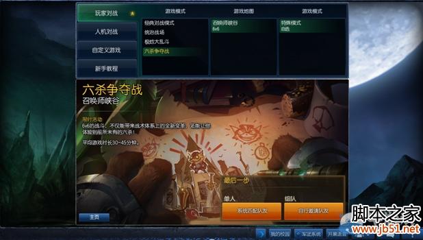 LOL六杀争夺战模式: 六杀争夺战是基于召唤师峡谷地图上的一种新游戏模式,在这个游戏模式下,蓝方和紫方会各有六名召唤师进入对局。只有 10级或以上的召唤师才能参与战斗。该模式的胜利条件与常规的5对5召唤师峡谷是一样的。 参加六杀争夺战的方式如下: 1. 点击主界面上的PLAY按钮,选择玩家对战,再选择六杀争夺战,即可进入匹配队列,寻找一同游戏的队友或对手