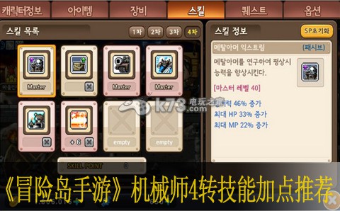 这是我个人的配点,玩家当然可以依照自己爱好搭配,以下仅供参考,到150等的时候,会有多余6个点,可依玩家喜好自由配点。一转:低等先把第一个技能点满,可以先把第二招点1,方便打怪,其余任意搭配二转:位移往上飞的最先满点1即可,再来第二招被动先点满,其余顺序任意搭配叁转:这里必须注意!!!!!先把第一招点满就好,对于刚叁转的机甲而言,重机枪耗