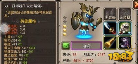 电魂在之前的版本是很废材的一个英雄,初始3星,经常性出现在一些运气不好的玩家288宝箱中,如果是之前抽到了,估计大家都会换号重来。不过随着安卓1.8.1版本的来临,将大招改成了双倍伤害,于是会电魂的热度立刻就高涨了起来。属性3星初始的电魂,有着非常蛋疼的三维成长,三维都不出彩,也就是国人说的中庸!中庸的成长带来中庸的属性,各项数值都是很中肯的水准
