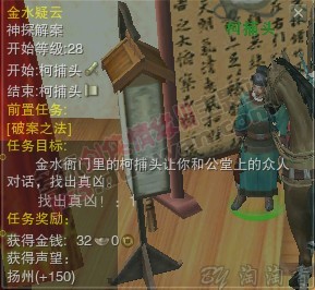 剑网3金水疑云怎么做?剑网3金水疑云任务攻略任务名称:金水疑云>任务等级:28>任务地图:金水镇>接任务NPC:柯捕头>交任务NPC:柯捕头>任务奖励:11950点阅历,32银>前置任务:破案之法>任务类别:对话>>任务流程:>1.下图位置接任务>>>2.与周围如下NPC对话得证据:张屠户,李屠户,秀茹,仵作>>3.对话完成任务>>4.获得奖励>1.接任务: