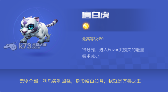 天天酷跑3D游戏里面的唐白虎是一款可爱的白虎造型,其宠物的定位属于一只纯得分宠,虽然其级别只有一个太阳,不过在游戏里面的表现却十分的令人满意,相关下载:K73.COM这宠真的不错,可以减少进入奖励关卡所需的能量,而且还会触发收集物分数翻倍!纯得分宠。我不敢说太多,但fever关卡得分最少也会占30%以上的得分。而14%的减消耗可以更快的触发fever,更何况