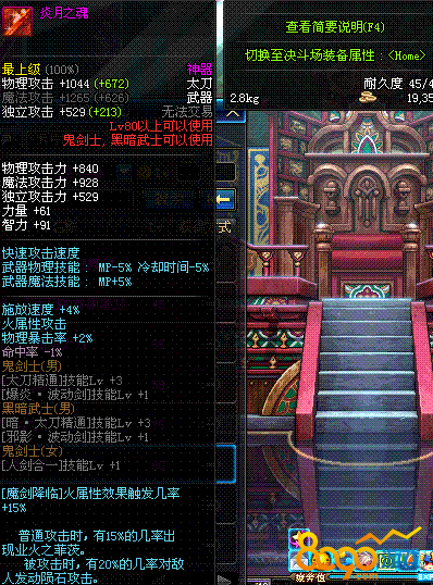 炎月之魂是dnf端游中80级的领主粉太刀,鬼剑士、黑暗武士可以使用,在地下城:克雷发电站BOSS业火之菲茨爆落或者在NPC佩拉维恩处购买,下面就和我一起来看看这件装备的具体属性吧。 该武器拥有快速的攻击速度和相对均衡的属性面板,其主力属性为:自带火属性攻击,鬼剑士技能太刀精通+3、爆炎·波动剑技能+1,魔剑降临火属性效果触发几率+15%,普通