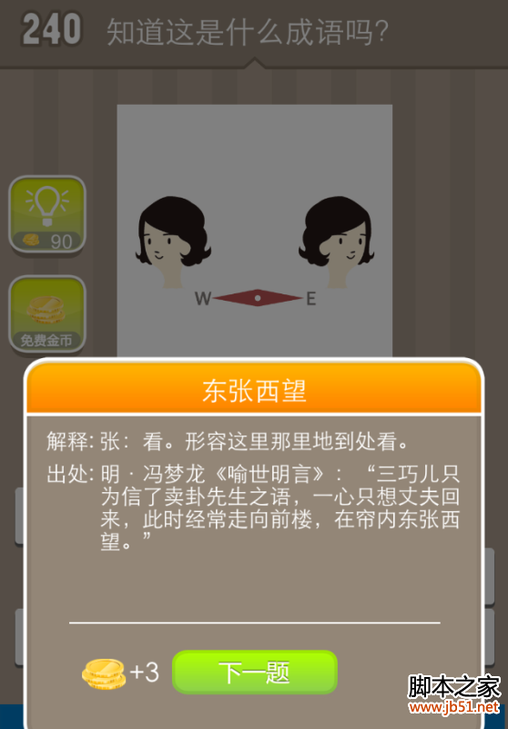 这是疯狂猜成语里的一道关卡,图上显示是两个女人的人头黑色头发,一个朝左看一个向右看,下面还有一个红色指南针,分别指着W和E方向,这个成语是?答案是:东张希望解释: 向四处张望。形容心神不安的到处看。出处: 明·冯梦龙喻世明言:“三巧儿只为信了卖卦先生之语,一心只想丈夫回来,此时经常走向前楼,在帘内东张西望。”解析:这道题
