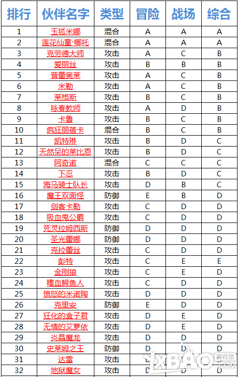 全民打怪兽这个游戏中,有着众多的伙伴选择。对于很多新手玩家来说,全民打怪兽哪个5星伙伴最好,基本都不知道,呢我跟大家全民打怪兽五星伙伴的实力排行,实力评分为A到F六个分数段,分数越往前实力越强,评分主要依据两个方面:输出能力和生存能力,下面是五星伙伴的排名表: 上文就是全民打怪兽5星伙伴排行榜的全部内容了,文章的版权归原作者所有,在此仅