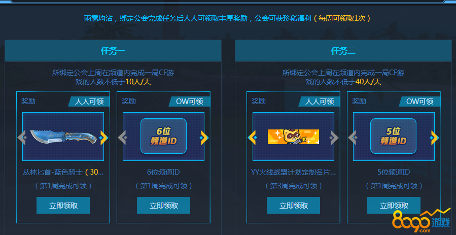 穿越火线(CF)的YY名片是哪里来的?最近在打游戏的时候,看到不少人在用YY名片,很多小伙伴也在开始好奇这个名片的获得方式。 这个YY定制名片是在一个叫火线战盟计划的活动中获得的活动地址为:http: www.yy.com web cf_cooperate index.html yybag。领取需要一定的条件。 首先,你需要绑定自己信息和公会(不会操作