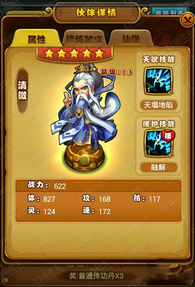 仙剑奇侠传手游清微为五星13品伙伴,属于土系,初始体能是很高的,速度也很快,拥有天赋技能天塌地陷和援护技能融解,下面我从清微属性、清微技能、清微培养等方面为小伙伴们做了详细介绍。清微属性清微技能天塌地陷,天赋技能,以泰山巨石从天而降,攻击敌方全体,同时增加自身防,持续3回合,最早第2回合释放,4回合冷却。融解,援护技能,以自然之土元素,降