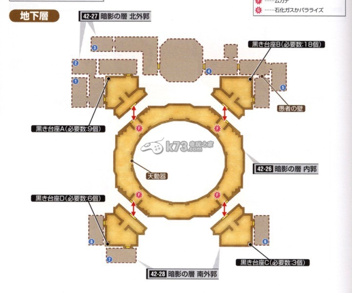 阴暗的大灯台地下先说解迷,这里的解迷其实很容易,杀死敌人出黑の珠,放在各层4个角落的台上,然后电梯就可以前往下一层,但记住,不要放超过了,超过了就直接全部没掉,又要重新放。的地图上有标明各个台座需要多少珠子,图还算比较清晰,认真看。(图来在FF官方U本攻略)暗影の層剧透向 " title= "最终幻想12+国际版图文攻略剧透向 " >这层没东西好拿,专心解迷。
