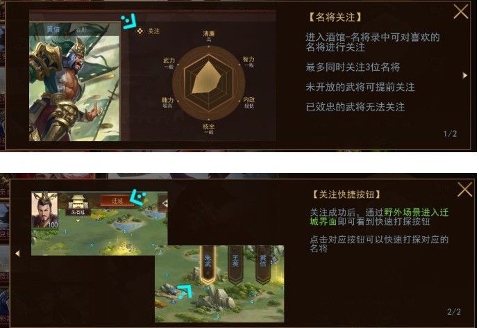 梦想帝王手游中400多位武将,大部分的武将都是需要获取的,而且有很多名将存在,能力好,属性高,那么这些名将可不可以免费获取呢?下面让我来告诉大家如何免费获取名将。梦想帝王手游名将免费捕捉攻略 1.快速打探名将酒馆-名将录中可以提前关注自己喜欢的名将,最多同时关注3位;关注成功后,在野外场景-迁城界面可看到屏幕右上角的“快速打探按钮”,点击对应按