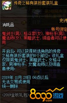 DNF在国庆的金秋礼包中加入了金秋装扮花篮凭证的设定,玩家可以使用这个凭证来兑换多款装扮自选礼盒,其中有一个传奇之稀有装扮套装礼盒,那么这个传奇之稀有装扮套装礼盒怎么样呢?接下来我就为玩家们带来传奇之稀有装扮套装外观展示! 在国庆版本上线的金秋礼包中,玩家购买一套可以获得5个金秋装扮花篮凭证,玩家使用这个凭证可以兑换几款装扮自选礼盒,其