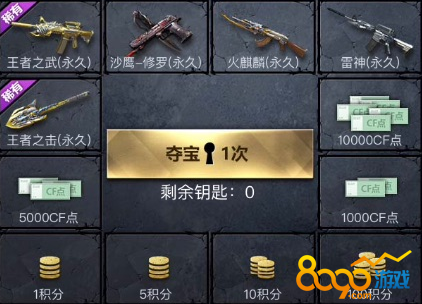 8月王牌夺宝活动来袭,这个千变轮回第二奖池的抽奖热度还没过,这王牌夺宝活动紧随而来,小艾花费了500试水了下,好吧,果然是连黑的人玩什么游戏都不见顺。 8090小艾原创,未经授权,禁止转载 王牌夺宝的实物奖励还是不错的,王者之武、王者之击,两把王者武器都是永久的,然后是沙鹰修罗、火麒麟、雷神也都是永久的,其次就是CF点和积分,最高的1wcf带你,
