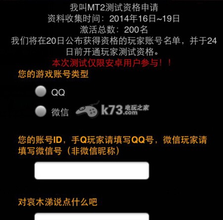 我叫MT2的封测也开启了,很多小伙伴激活码都没弄到手吧。我为小伙伴们带来我叫MT2激活码领取方法步骤介绍。领取方法:1、点击进入:K73传送门2、勾选游戏账户类型,QQ或微信。3、填写游戏账号,QQ号或微信号。4、填写你对游戏的一些想法。5、提交,等待激活码发放。领取时间:10月16日-19日激活码数量:200个上面即是我叫MT2激活码领取方法步骤介绍的内容