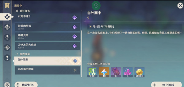 原神自外而来任务要玩家去寻找另外半截船,这个任务是1.6版本新更新的世界任务,任务的完成方法其实并不难,具体的任务流程游戏鸟我会在下方的攻略中分享,玩家们可以多看看攻略了解自外而来任务的完成方法。 原神自外而来任务攻略 自外而来是原神1.6版本中新增的一项世界任务,玩家们需要根据任务指引寻找另外半截船。在无名岛屿中,所在的高山的山顶处有一处