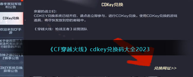 CF穿越火线是一款刺激的枪战风格的手游,在这个游戏中,玩家进入到真实的3D场景的战斗的地图中来,让大家在这款大逃杀风格的游戏中来一展自己的强大的战斗力!游戏中大家可以通过cdkey兑换码获取额外的一些资源!那么CF穿越火线CDK兑换码有哪些,怎么获得呢?一起来看看吧!CF穿越火线cdkey兑换码大全2023 " >cf手游cdkey兑换码大全2023注意:请
