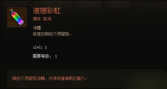 我为小伙伴们带来了暗黑3国服液态彩虹在哪刷 液态彩虹获取攻略,感兴趣的朋友们可以跟着我去下文了解一下哦!暗黑三中液体彩虹是制作牧牛杖的重要材料,那么这个液体彩虹到底怎么才能够获得呢?就让我我来告诉你们吧。Liquid Rainbow(液态彩虹),任务章节2-6-2(赫拉迪姆的背叛者),进入达厄古绿洲后最下方钟摆形区域(有带木门的木屋和水源),随机开启炼金师事
