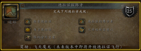 魔兽世界6.2德拉诺探路者成就怎么做。魔兽世界如何解锁德拉诺飞行。魔兽世界6.2德拉诺探路者成就奖励飞天魔龙展示。魔兽世界飞天魔龙哪来的,飞天魔龙好不好刷。“德拉诺探路者”成就该成就包含以下部分:探索德拉诺--探索德拉诺的各个区域。大师级财宝猎人--在德拉诺发现100份宝藏。(不包括塔纳安丛林)德拉诺的博学者--完成各个地图的德拉诺任