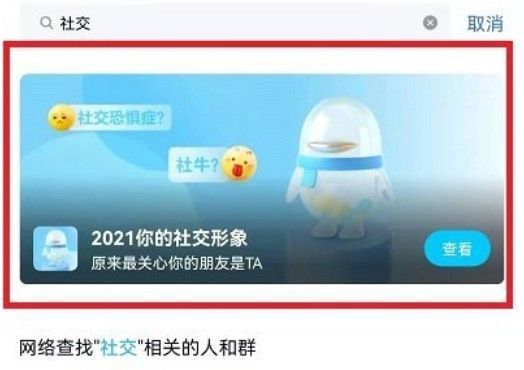 QQ年度数据报告在哪看?2021年度报告已经出来了,各位用户都可以去查询自己的年度报告,想要知道2021QQ年度数据报告的查询方法,可以通过下面游戏鸟我带来的攻略了解,我会具体的为的介绍QQ年度报告的入口,具体的参考下面我带来的查询方法即可了解哦!qq年度报告入口2021 首先要进入QQ,在首页的搜索框中输入社交形象,这样就会出现一个活动版块,就是下面红色框
