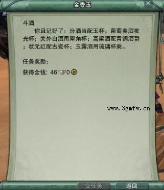 剑网3斗酒任务怎么做?剑网3斗酒任务攻略任务名称:剑网3斗酒接任务NPC: 金香玉交任务NPC: 金香玉任务奖励:阅历:2050;金钱:46银;任务需要等级:57任务描述:龙门客栈的金香玉让你与李复斗酒十。。剑网3 斗酒·首先找到金香玉接斗酒任务,她会告诉你,汾酒-玉杯,葡萄美酒-夜光杯,关外白酒-犀角杯,高粱酒-青铜酒爵,状元红-古瓷杯,玉露
