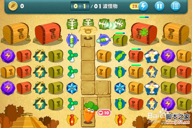 保卫萝卜挑战44攻略挑战44关:这关的布局异常关键 如果走错一步不可能金萝卜 下面为小伙伴们讲解下布局一上来用最快速度击破右边的第一个红色箱子!要快!之后如下图 升级鱼刺 之后在第一个鱼刺下方建立减速 并在第一个转弯的上面建立减速 这两个减速必须在游戏初期建造完毕 之后建造电塔 优先攻击屏幕右侧物体!!在攻击完屏幕右侧的所有物体之后除去飞机升级到满级 其