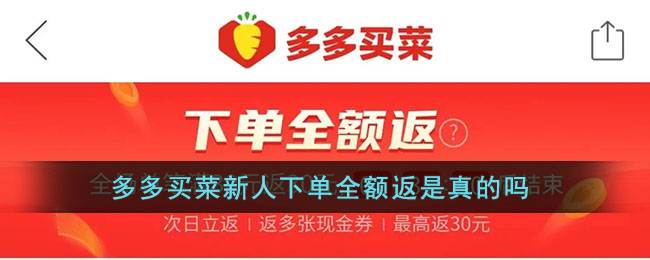 多多买菜新用户进入后,会弹出全额返的活动弹窗,可以领取大额红包福利。那么多多买菜新人下单全额返是真的吗_多多买菜新人下单全额返在哪里领呢?下面我就为小伙伴们带来了详细的介绍,我们一起来看看吧!多多买菜新人下单全额返是真的吗 " > 多多买菜新人下单全额返是真的吗?是真的,其实它和新人全额返都是可以享受到返还优惠券的福利的,只不过与新人全额返
