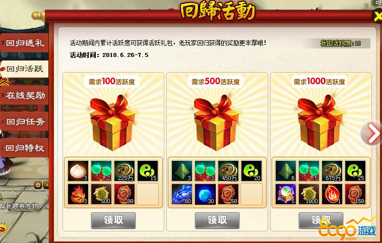 神仙道的修仙之路已经持续了7载有余,其中必定有很多玩家因为各种原因,暂时离开了神仙道的世界,为了帮大家重拾回忆,重新捡起那份纯真的喜欢和热爱,老玩家回归活动正式开启。 老玩家回归活动一共分为5个部分,回归送礼、回归活跃、在线奖励、回归任务和回归特权,只要满足条件的老玩家,都可以通过这些活动拿到丰厚的奖励,尽快帮大家追上大部队的节奏。