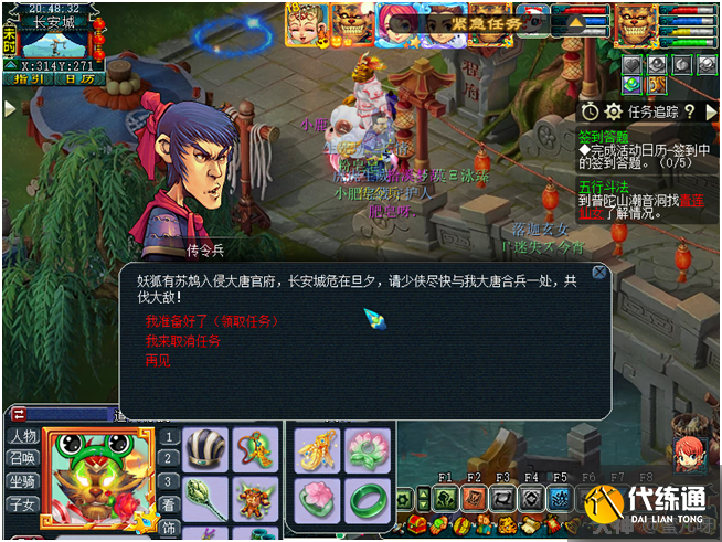 梦幻西游紧急任务热血盛唐通关攻略:活动时间:2022年1月20日20:00-2022年1月20日21:00活动条件:角色等级≥50级,队伍人数≥3人活动地点:传令兵(长安城315.270)紧急任务“热血盛唐”上线提示到长安城(315.270)处找传令兵领取任务,拯救长安城点击传令兵(长安城315.270),选择“长安不会陷落!”去长安城328.248处与各“