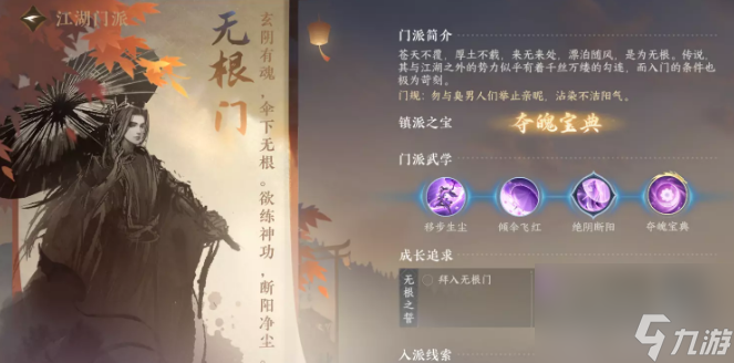 逆水寒手游首先加入无根门去汴京坐标(1060,880)找到路歧人对话后触发奇遇,使用技能--江湖--趣味--摄阳伞,收集三个男玩家的阳光即可加入成功,加入后学习完全部的技能就可以毕业该门派。逆水寒手游无根门怎么毕业一、无根门毕业流程攻略1、加入方法:去汴京坐标(1060,880)找到路歧人对话后触发奇遇,根据指引完成任务,然后使用技能--江湖--趣味--摄阳