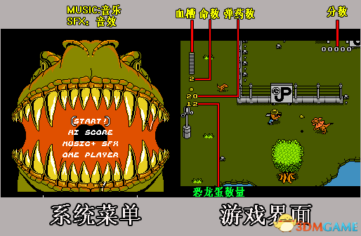 ■操作篇方向键———-移动A键—————跳跃|划船|确认B键—————射击SELECT———-选择|切换弹药START————暂停■基础知识●系统界面开始游戏最高分数(美式游戏都很喜欢搞分数排名)音效选择(MUSIC为音乐,SFX为操作音效,均可切换到无声)游戏人数(选择2P玩)●游戏界面白的为血槽,下面分别是命数、弹丸数