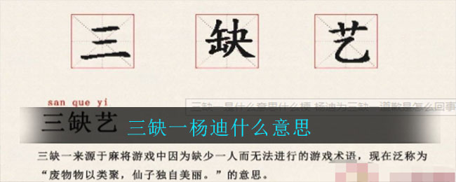最近大家应该都看了热搜了吧,里面有一个非常明显的标题就是“三缺一杨迪”,是不是很好奇这个又是从哪里来的梗? 三缺一杨迪意思介绍这件事情还是要从青春环游记中的一期说起,里面有一个猜词的游戏,在贾玲说出了“鹿晗、吴亦凡、黄子韬”之后想让刘敏涛说出张艺兴,但是大家知道的敏涛姐是一个2G少女,是不一定能够get到的,之后杨迪就喊出了“三缺一”,还被