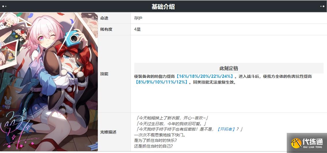 崩坏星穹铁道余生的第一天作为游戏中的一个光锥,稀有度属于4星级,在同级光锥中强度还是不错的。主要的作用是使装备者的防御力得到提高,同时在战斗时还能提高己方队伍全体的伤害抗性,下面是这个光锥的各项信息,大家可以了解一下。崩坏星穹铁道余生的第一天光锥图鉴↓↓↓点击下方链接进入崩坏星穹铁道wiki图鉴大全↓↓↓(聚侠网编辑实时更新中)>>>崩坏星穹