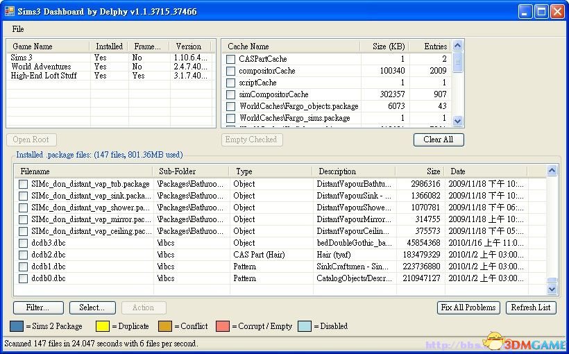 按右下角, "Refresh List " 的按钮,它就会开始检查。检查完后,有问题的 mods,会以不同的颜色来表示:深蓝色:Sims 2 package黄色:重複棕色:相冲玫瑰色:坏掉或是空的mod深蓝色:被停用的 Mod接下来,按 "Select " 的按钮来选择你要移除的 mods,再按 "action "Filter 按钮是让你只显示某一类有问题的