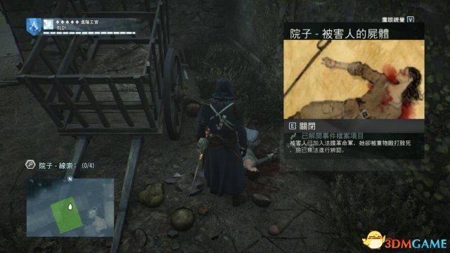 刺客信条:大革命-死去的国王DLC谋杀之谜解法图文详细攻略。谋杀之谜01.平等的争议导读:此案件共4处调查地区。简介:法国革命军中有为数不少的女性加入,但这名女子却在为共和国捐躯之前就惨遭杀害。找出杀她的凶手。院子-线索:共4处被害人的尸体:(在院子一角的手推车旁边)被害人已加入法国革命军,她却被重物殴打致死,脸已无法进行辨认。悲伤的士兵:(站