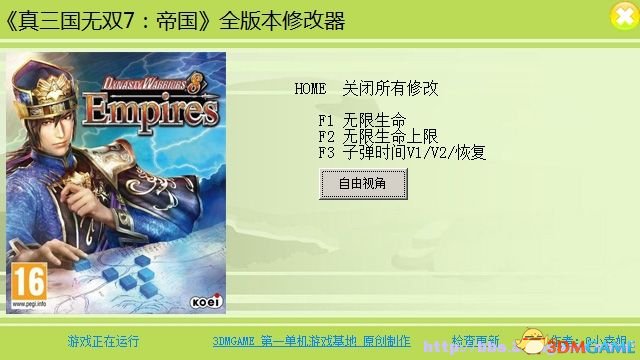 真三国无双7:帝国无限生命子弹时间自由视角修改器。对应游戏版本 :基于台版 v1.0制作,采用特征码方式亦或支持其他版本下载地址:https: dl.3dmgame.com 201503 56274.html基本功能:修改器一共英简繁三种语言,在简体、繁体以外的系统上均显示英文。右键点击修改器界面最小化。按下Home键或退出修改器,关闭所有修改。按下对应快