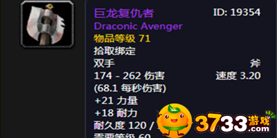 魔兽世界怀旧服巨龙复仇者有什么属性?相信很多玩家感兴趣,我就为小伙伴们带来魔兽世界怀旧服巨龙复仇者属性介绍,感兴趣的玩家不要错过。魔兽世界怀旧服巨龙复仇者属性是什么Draconic AvengerID:19354物品等级:71需要等级:60双手:斧能否交易:装备后绑定属性力量加成:21耐力加成:18攻击伤害:174-262攻击速度:3.20每秒伤害:68.1