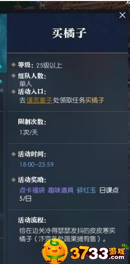 逆水寒奇遇买橘子怎么触发?在逆水寒游戏中,有一个奇遇有点难度,就是买橘子奇遇,怎么做,皮皮寒在哪,下面就由我为小伙伴们介绍为逆水寒奇遇任务买橘子攻略,感兴趣的朋友不要错过咯! 逆水寒奇遇买橘子怎么触发: 等级要求:25级以上 组队人数:单人 活动入口:在汴京的谨言童子处领取任务 限制次数:1天1次 活动时间:18:00-23:59 活动奖励