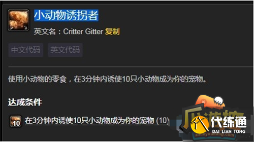 魔兽世界小动物诱拐者成就怎么做?魔兽世界游戏中有很多成就,完成就可以领取到奖励,小动物诱拐者成就需要玩家在怪定时间内诱拐一定数量的小动物,下面我就为小伙伴们带来魔兽世界小动物诱拐者成就攻略,希望可以帮到大家。魔兽世界小动物诱拐者成就攻略 成就描述: 使用小动物的零食,在3分钟内诱使10只小动物成为你的宠