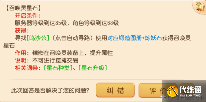 召唤灵星石这是本次公告后,最新推出的物品,能够镶嵌在召唤灵装备上,从而提升装备属性,变相增加召唤灵能力。一共有6种召唤灵星石种类,使用对应锻造图册+炼妖石便可获得。召唤灵星石升级可以使用银币2W或者消耗[星石粉尘]*1获得10点经验。召唤灵星石到达5级 8级 10级时分别需要消耗10 20 30个[星石精魄]附灵,三阶都附灵属性后,将解锁相魂属性。为了方便大
